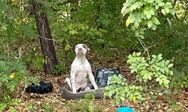 The sweet boy was dumped in the woods by his heartless owner along with his bed, old toys, and a bag of sealed dog food and left to die.