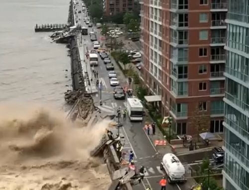 In several videos, buildings can be seen leaning precariously before sliding into fast-moving waters. Emergency crews are visible nearby, working to secure the surrounding area and prevent additional collapses.