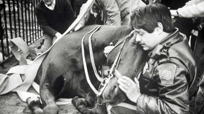 In October 1989, Boston Police Officer Frank Pomodoro and his mounted partner, a powerful and calm horse named Fritz, were part of the city’s everyday presence. Mounted units have long been woven into urban life, their horses offering both practical service and a reassuring sense of tradition. That morning, however, the steel plate covering a construction opening near the station gave way, and Fritz slipped into the pit below. What followed was not a tale of panic alone, but a remarkable moment of collective care.