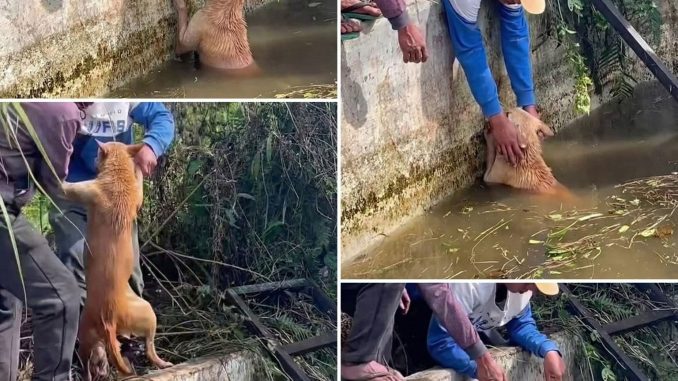 It happened quietly, without cameras prepared or crowds watching. Just a deep canal, a tired stray dog, and two young men who chose to stop instead of walking by.