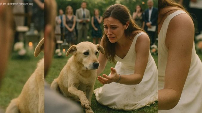 It started as a ragged breath at the end of the aisle. Heads turned. A thin yellow blur slipped through the flowers and lanterns, mud spattering the white runner like freckles. A dog, ribs showing under a faded coat, stopped three feet from my shoes and looked up at me as if the world had finally delivered the right address.