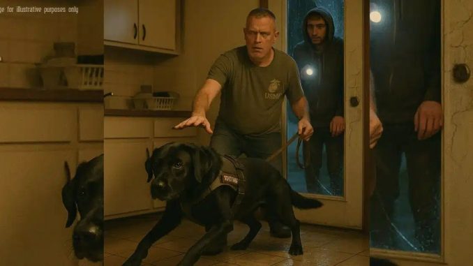 Daniel’s voice was flat and practiced, the way a command is when it’s drilled into muscle memory. Rain hissed against the windows. The back door had coughed a shatter of glass and a pair of rushing feet. Ranger surged from his heel, a black streak across the kitchen tile, claws finding purchase, breath steady, harness ringing a bright little note in the dark.