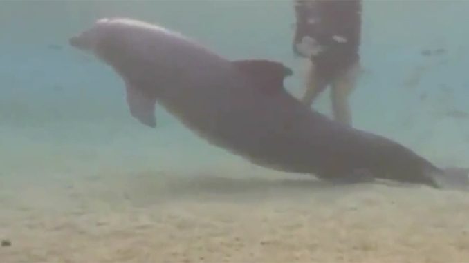 Yet, subtle signs began to suggest that something was amiss. The dolphin’s movements grew irregular. Instead of her usual smooth and effortless swimming, she began twisting, tilting, and circling more anxiously. Something seemed to hinder her natural grace, and the divers noticed immediately that this was not normal behavior.