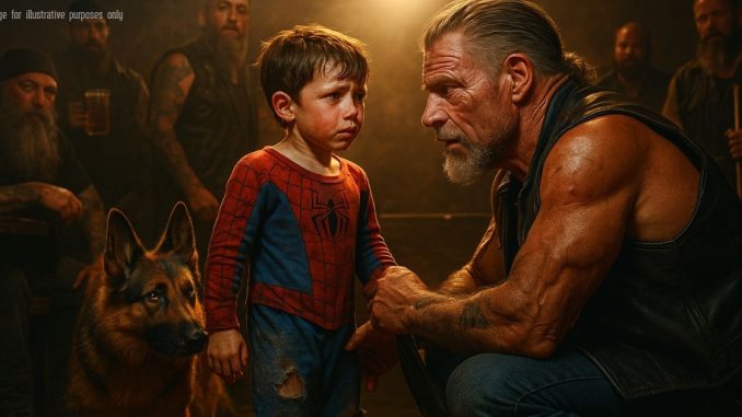The boy swallowed, his small fingers clutching the worn leather cut of the man he had walked straight toward—the tallest, scariest figure in the bar. Snake, president of the Iron Wolves, six-foot-four with a scar running from temple to jaw and arms like tree trunks, looked down in shock as this tiny stranger tugged at his vest.
