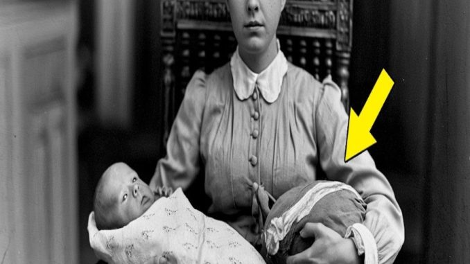 That’s why one small photograph, dated March 1906 and labeled “Mrs. Katherine Hartwell and children”, has continued to unsettle people who encounter it today. On first glance, it appears to show a mother holding a baby in the formal, carefully posed style of the era. But after a closer look—after the eye stops reading “mother and child” and starts noticing shapes, shadows, and intent—viewers often realize there is something else in her arms, wrapped the same way, positioned the same way, and yet not easily explained by the usual rules of portraits.