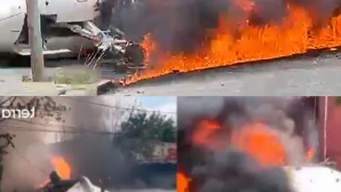 Aerial view of an airport crash site with large flames and thick black smoke.