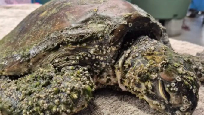 When rescuers approached Kalani, they immediately understood the seriousness of her condition. Her shell was almost completely hidden beneath marine growth. Her movements were minimal. Each breath seemed to require effort. For sea turtles, a heavy covering of barnacles and algae can be a sign that the animal has been struggling for a long time, unable to move with its usual strength.