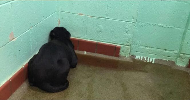 There are moments that do not need sound to feel overwhelming. In one animal shelter, a single photograph captured such a moment. A dog stood motionless, her body pressed against a wall, her eyes fixed on nothing in particular. She did not bark. She did not move. She simply stayed still, as if hoping the world would pass her by.