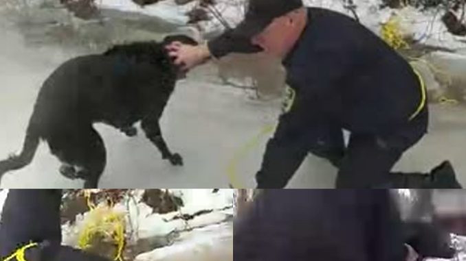 Trooper Szarek made that call. With support from fellow responders, he entered the icy water, moving carefully toward the dog. Another trooper followed to assist, ensuring the rescue was not attempted alone.