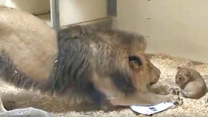 In the quiet early hours of a zoo morning, before crowds gather and voices echo, something remarkable unfolded behind the scenes. Cameras quietly recorded a moment that felt both ancient and deeply moving. A powerful male lion, known for his commanding presence and calm authority, slowly lowered himself to the ground to meet his newborn son for the very first time. There was no roar, no display of strength. Instead, there was stillness, curiosity, and a gentle pause that seemed to hold the weight of generations.