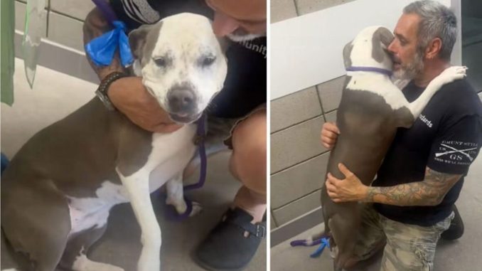 In animal shelters, there are moments that stop time. Moments so quiet and sincere that no one needs to say a word to understand what’s happening. For Ruby, a small white-and-gray Pit Bull mix, that moment arrived the day she finally went home — not with a bark or a leap, but with a hug.