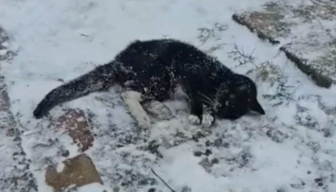 The cat was found on a suburban street in McKeesport, Pennsylvania, after collapsing on an icy driveway. Severely weakened and unable to move normally, the animal appeared to be struggling to remain conscious.