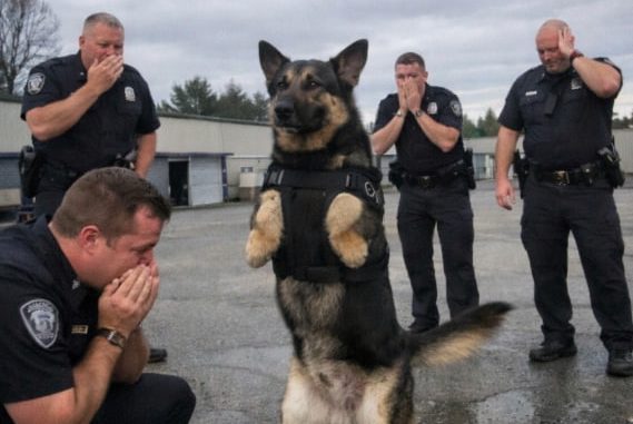 Whenever someone entered the room wearing a uniform — police officers, emergency responders, security staff — the dog reacted differently. His ears lifted. His eyes followed them. His tail twitched slightly.