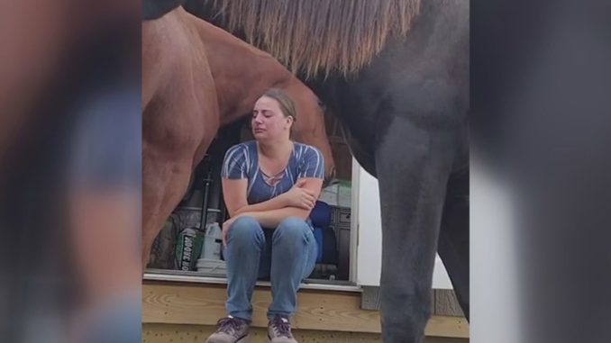 Not all viral moments are loud or dramatic. Some arrive gently, almost unnoticed at first, and then slowly make their way into people’s hearts. One such moment came from a simple video shared online, showing a brown horse named Shiner approaching his caregiver, Shania, as she stood overwhelmed with emotion. She was going through a divorce and preparing to move that very day, carrying the weight of change quietly on her shoulders.