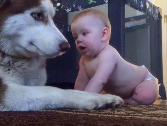 DG. Baby crawls over to husky to say ‘hi’ – then dad catches dog’s beautiful reaction on video
