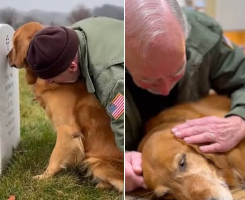 On a calm morning in a military cemetery, visitors moved quietly between rows of pale headstones. The air felt heavy, not with sadness, but with respect. Then something unexpected happened. An elderly dog slipped free from its handler, crossed the grass with surprising purpose, and stopped at one specific gravestone. Slowly, the dog lowered its body, bowing its head as if in recognition.
