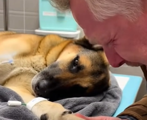 The dog cried out again — louder — pressing himself harder against the man’s leg, as if afraid he might disappear.