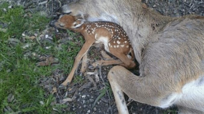 On a quiet stretch of road bordered by trees and open fields, a small figure stood motionless beside the grass. Drivers passed by, some unaware, others uncertain of what they were seeing. It was a young fawn, barely days old, pressed close to its mother who lay still on the roadside. The little deer remained there, as if waiting for her to rise and guide him back into the forest.