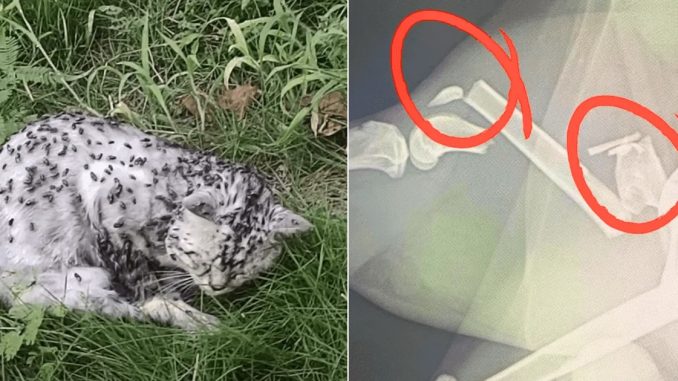The cat’s body was covered in untreated wounds, and insects had gathered around areas of exposed tissue. It was weak, unable to eat properly, and clearly in distress. Every few moments, its small body trembled, likely due to pain and exhaustion.