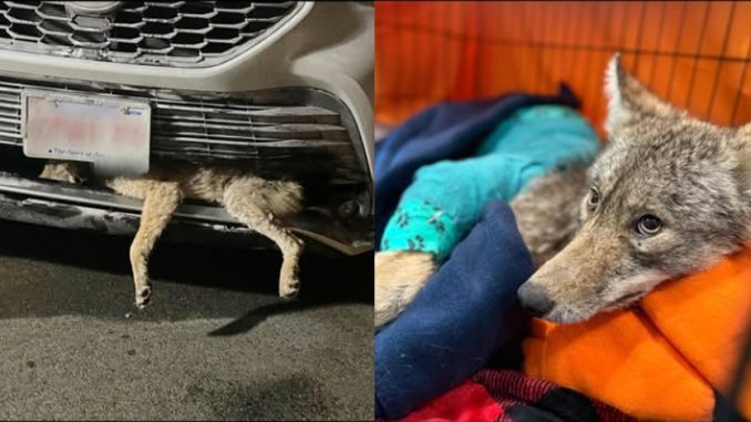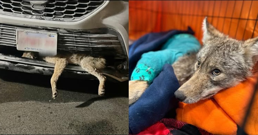 In this case, the driver was unable to stop in time when the coyote ran in front of her car. Shaken and emotional, she stepped out to assess the situation. What she discovered left her in tears. The animal was lodged in the front grill of her vehicle but was still alive.