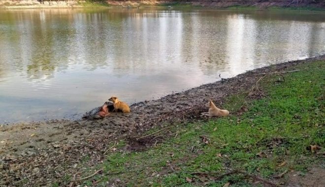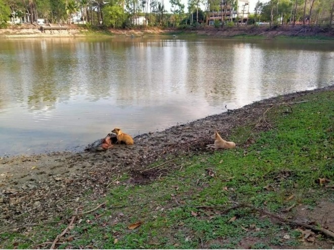 The scene might have remained unseen if not for a passerby named Ake Srisuwan. As he moved through the area, he noticed the unusual sight: an elderly woman lying in the mud with two dogs standing guard.
