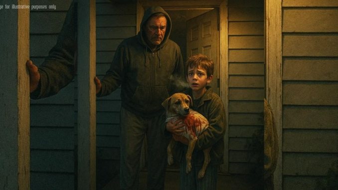 The knocking had started as a frantic little drumbeat, small fists on old wood, so desperate it cut clean through the late-night talk show murmuring from my TV. By the time I opened the door, I was already braced for some kind of emergency. What I got was a skinny boy in pajama pants and a jacket two sizes too big, bare feet on my concrete steps, clutching a dog whose fur was turning dark on one side.