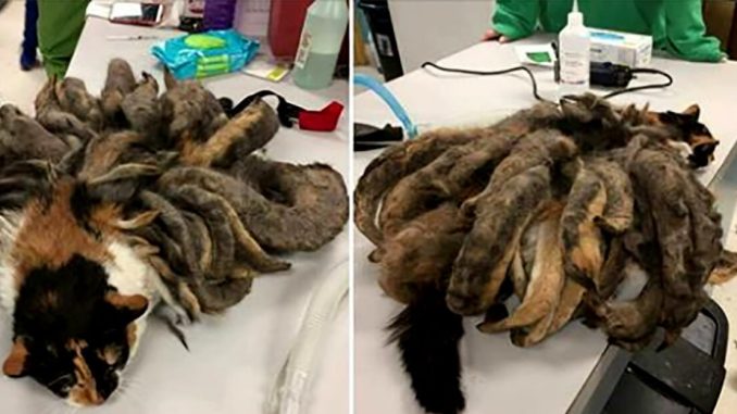 According to the rescue center, the cat had pounds of intertwined fur covering her body.