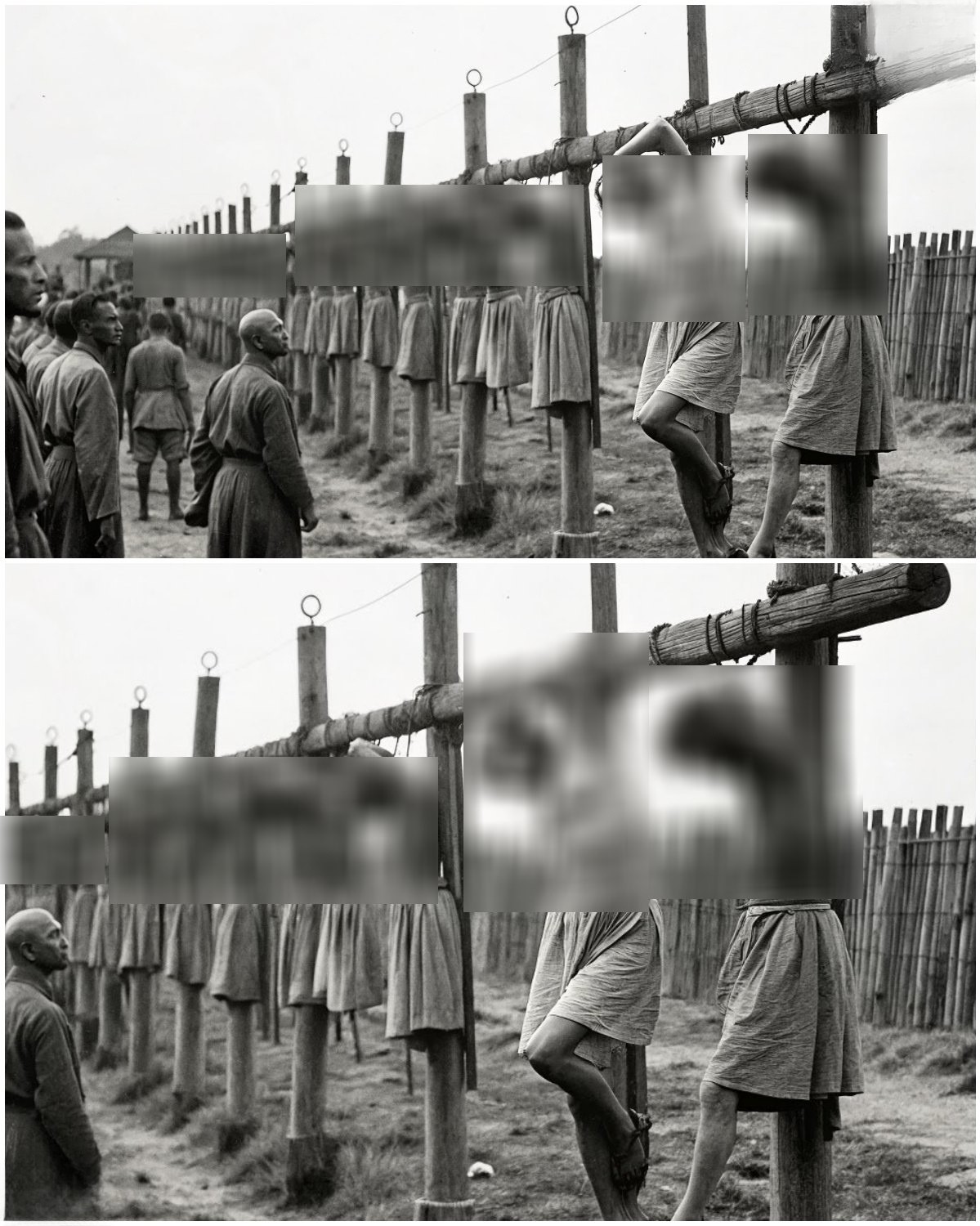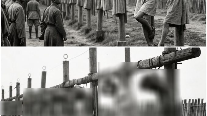 The captives were connected in lines using wooden restraints placed around their necks.
