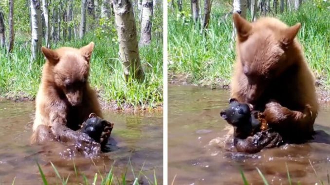 One particularly touching moment captured on camera showed Tamarack interacting with a small stuffed bear toy found in the forest.