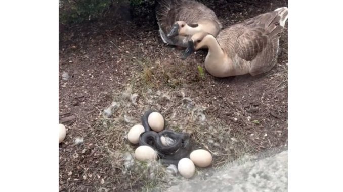 Snakes are known to seek out eggs as part of their diet. Meanwhile, geese are protective parents, often staying near their nests even when faced with uncertainty.