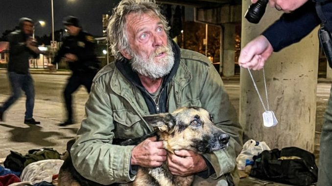 The night air settled low beneath the overpass, carrying the distant hum of traffic and the faint echo of footsteps above. Down below, the world felt paused, as if time had chosen this forgotten corner to slow its pace. A man sat quietly, gathering what little he had. Beside him stood a loyal companion, steady and watchful, as though guarding not just a person, but a story.