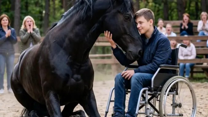 Amid this charged atmosphere, a young man in a wheelchair slowly approached the arena. His appearance alone shifted the energy of the crowd. Some were curious, others doubtful. Yet what followed became the kind of moment that lingers in memory, blending emotion, symbolism, and questions about the deep connection between humans and animals.