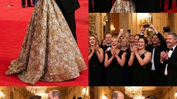 Princess Catherine was a vision of timeless elegance, wearing a structured, floor-length gown in a deep sapphire hue—a subtle nod, perhaps, to the historic engagement ring that shimmered on her finger. Beside her, Prince William cut a sharp figure in a classic black velvet tuxedo, his demeanor one of relaxed confidence.