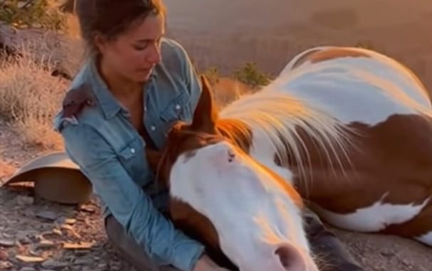 She gently lifted the mare’s head, resting it carefully in her lap. Her hand moved slowly along the horse’s neck, each motion deliberate and reassuring.