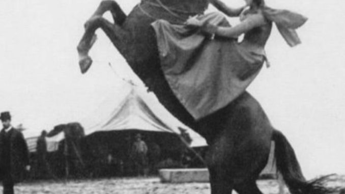 The image of Annie Oakley on a rearing horse is more than a snapshot of a performance.