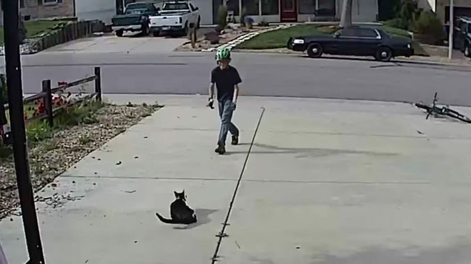 The recording showed a young boy walking toward the driveway, looking around briefly, and then sitting beside a cat resting in the sun. The child gently petted the animal, spoke softly, and stayed for a few moments before heading home.