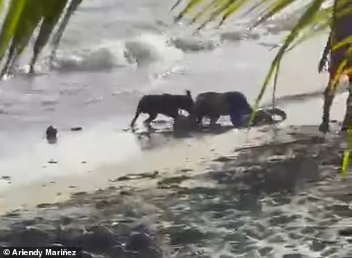 A male bystander (center) pinned the pit bull to the sand on the shore of Palenque Beach while another person helped out Luisa Encarnación (top right)