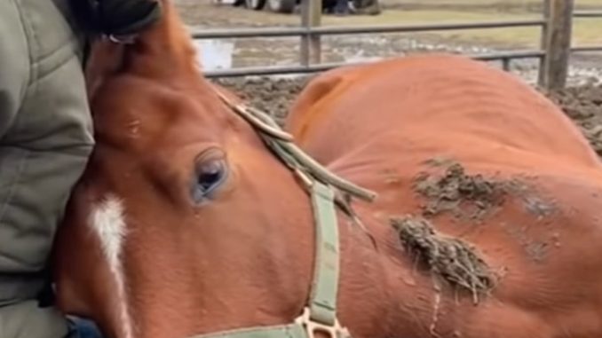 She knelt down, gently lifting the mare’s head into her lap, offering the simplest thing she could: comfort.