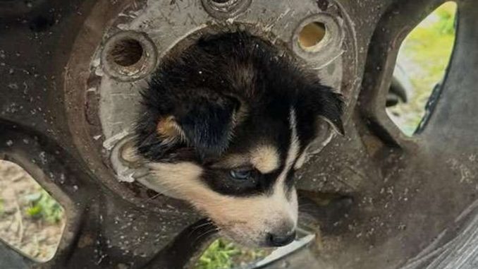 In this case, the circular opening of a tire rim likely caught the puppy’s attention. Once its head passed through, getting back out became much more difficult.