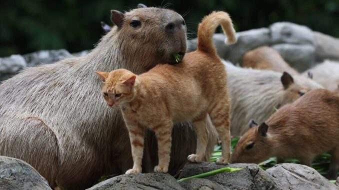 The cat, later named Oyen, did not encounter hostility or fear. Instead, he found himself among a group of capybara, animals known for their calm temperament and social nature. What followed was a quiet coexistence that soon turned into something more meaningful. Oyen began eating with the capybaras, resting near them, and gradually becoming part of their daily rhythm.