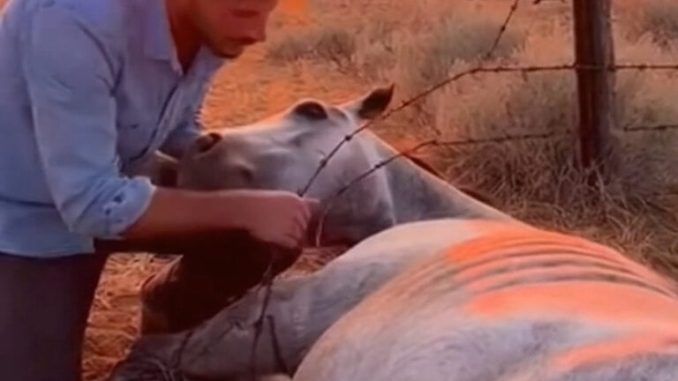 What Jake found was a gray mare, trapped in a rusted fence. Her leg had become tangled in twisted wire, restricting her movement and leaving her exhausted from trying to free herself.