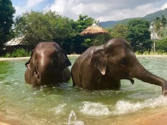 At first glance, the scene feels simple. Two elephants stand side by side in a clear pool, their large bodies partially submerged in cool water […]